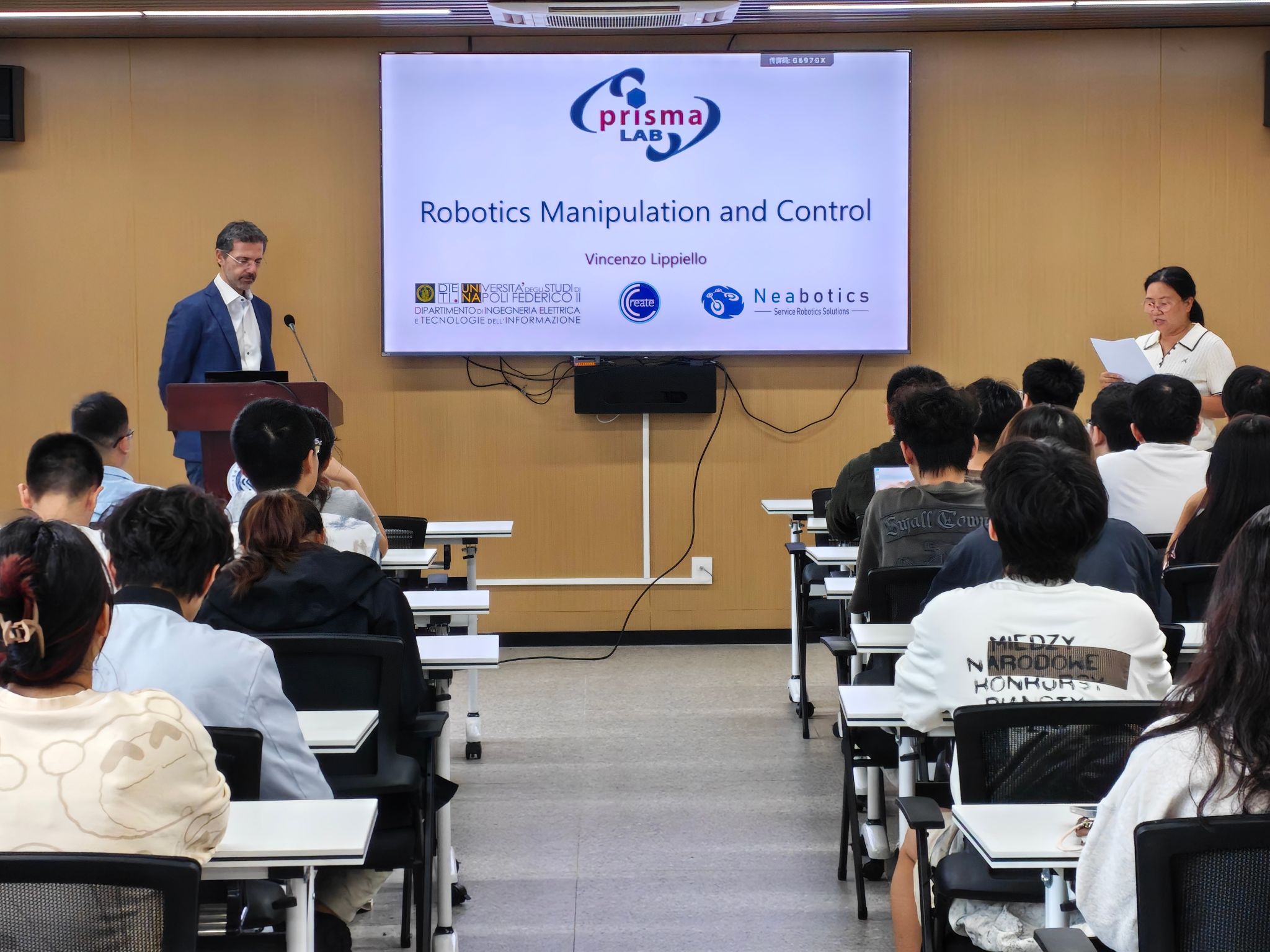 Vincenzo Lippiello 教授是机器人技术与自动化方向的国际知名专家,现任该校全职教授,并担任 PRISMA 实验室工业与服务机器人方向负责人。同时,他是 NEABOTICS 公司的创始人兼 CEO,在结构检测与维护机器人领域具有丰富的科研积累和产业经验。Lippiello 教授长期担任多本国际期刊编辑、多个国际会议程序委员会委员,已发表学术成果 150 余篇,在工业工程与自动化子领域中位列全球科学家前 1.7%,并参与和负责多项欧盟科研项目。
