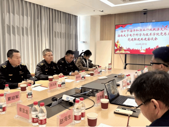 1月7日下午,海口市海洋和渔业行政执法支队、sunbet党总支党建联建共建座谈会在信息科技大楼507会议室举行。市海洋和渔业行政执法支队党总支书记、政委蔡於海;sunbet党总支书记林华出席会议。座谈会由林华主持。双方围绕海洋渔业执法智能化升级、禁渔期监管技术合作等展开交流,探索“党建+业务”融合新路径。